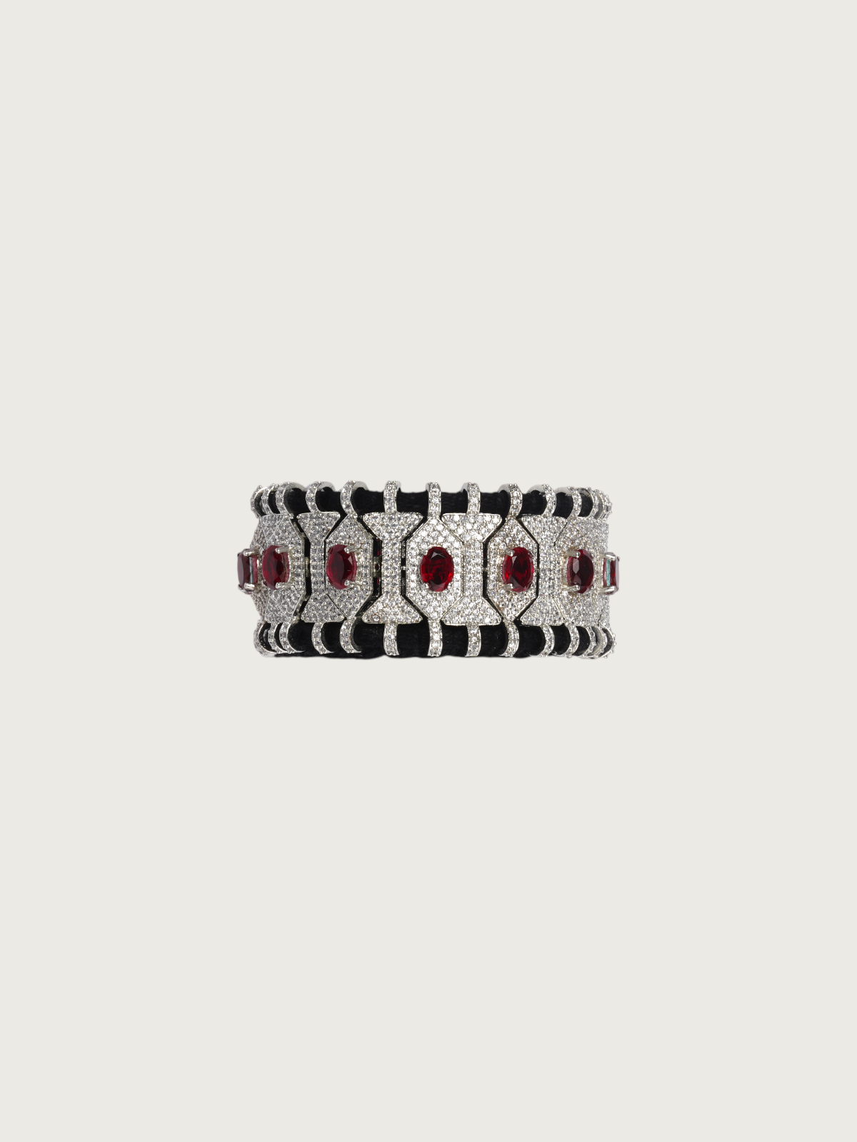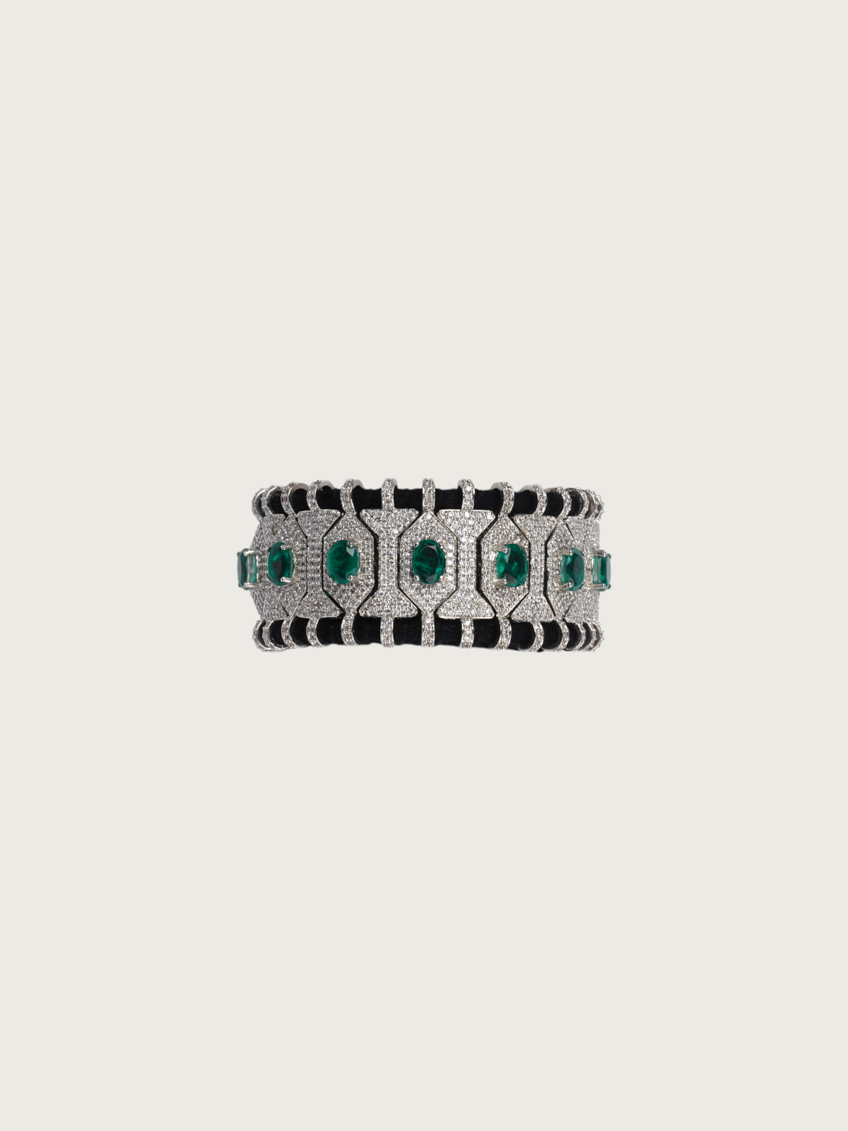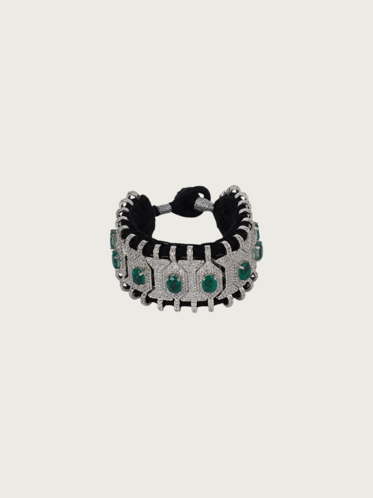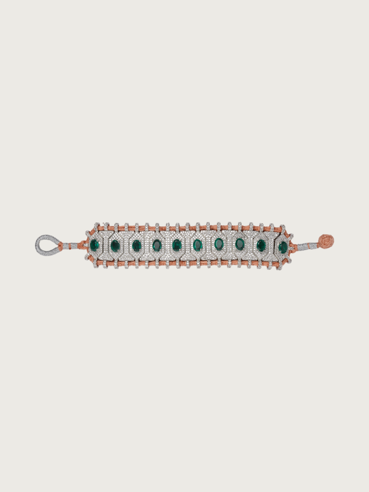 Experience the grandeur of royal Indian jewelry with this exquisite Mughal-inspired red bracelet. Featuring a stunning row of deep red, green, purple, sky blue stones set in a shimmering pavé-encrusted silver-plated frame, this handcrafted piece is woven with thread detailing for an elegant contrast. Designed to emulate the luxury of traditional heirloom jewelry, this bracelet brings the beauty of the past into modern elegance.