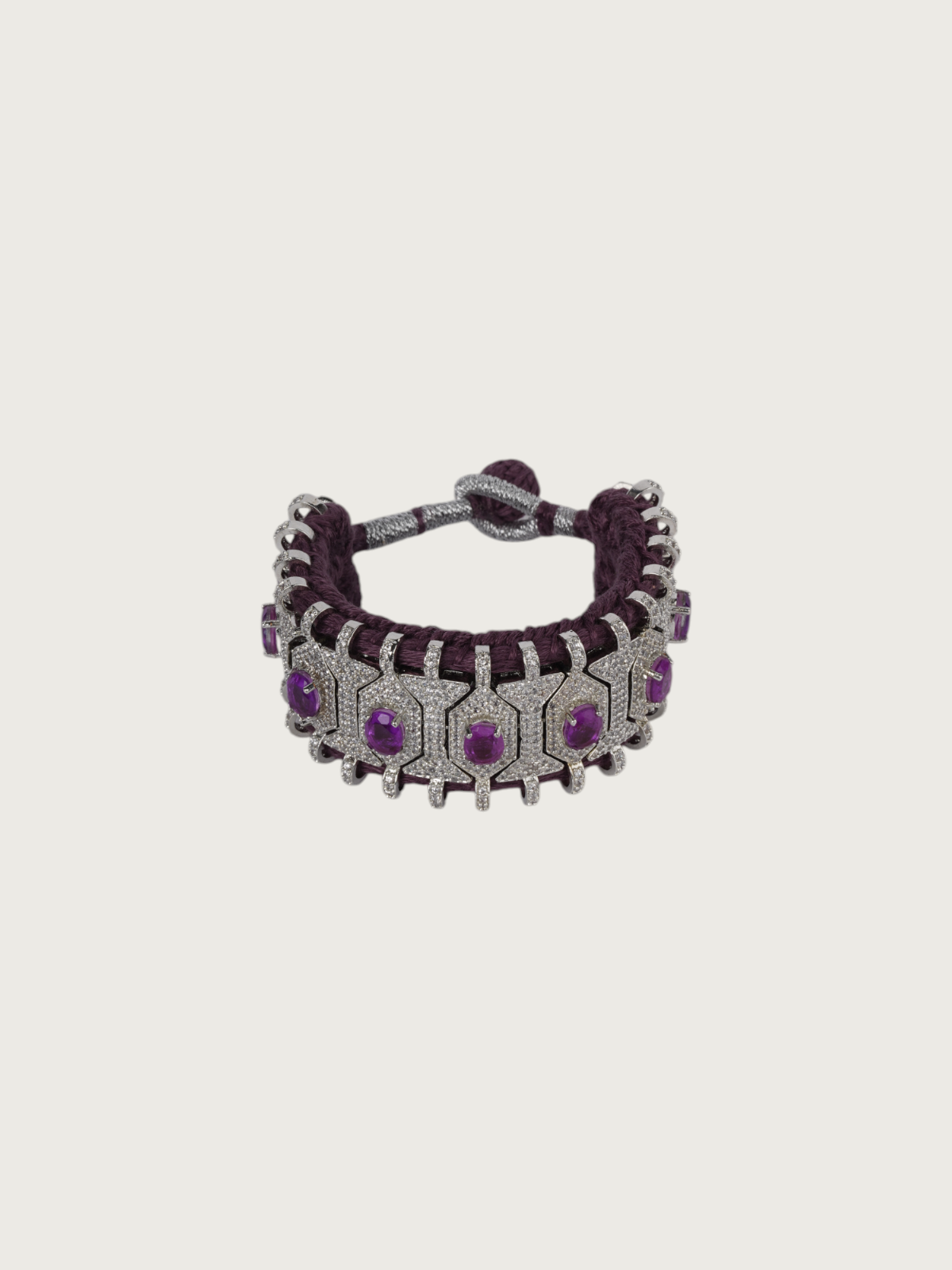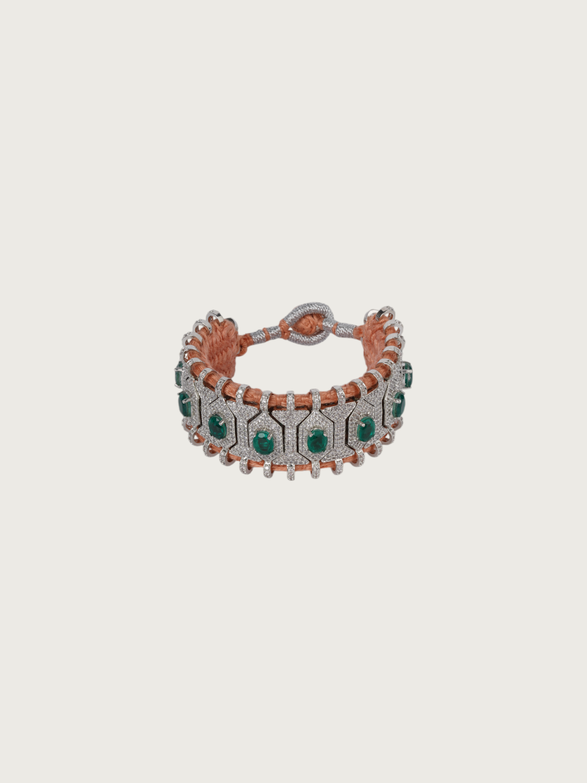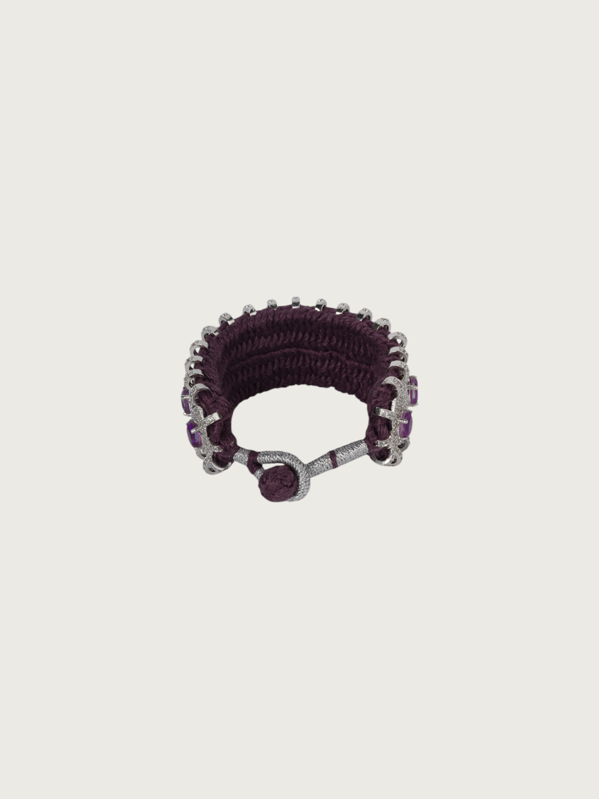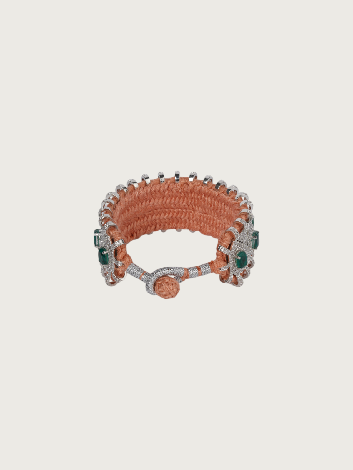 Experience the grandeur of royal Indian jewelry with this exquisite Mughal-inspired red bracelet. Featuring a stunning row of deep red, green, purple, sky blue stones set in a shimmering pavé-encrusted silver-plated frame, this handcrafted piece is woven with thread detailing for an elegant contrast. Designed to emulate the luxury of traditional heirloom jewelry, this bracelet brings the beauty of the past into modern elegance.
