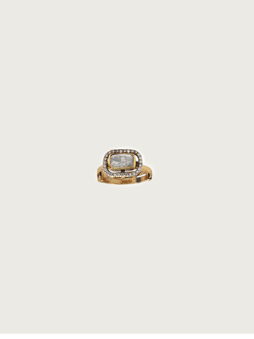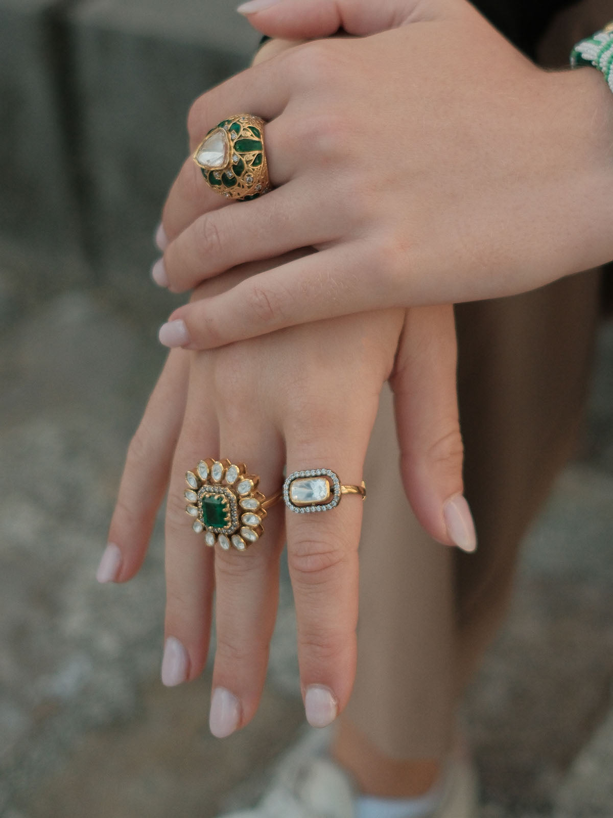 Experience royalty and heritage with this Polki Diamond Cocktail Ring, a stunning masterpiece inspired by Mughal elegance. Featuring an exquisitely hand-cut Polki stone in a classic rectangular setting, this ring is encased in a halo of fine uncut diamonds, all set on a gold-plated brass band. With its vintage charm and timeless appeal, this ring is a must-have for luxury styling.