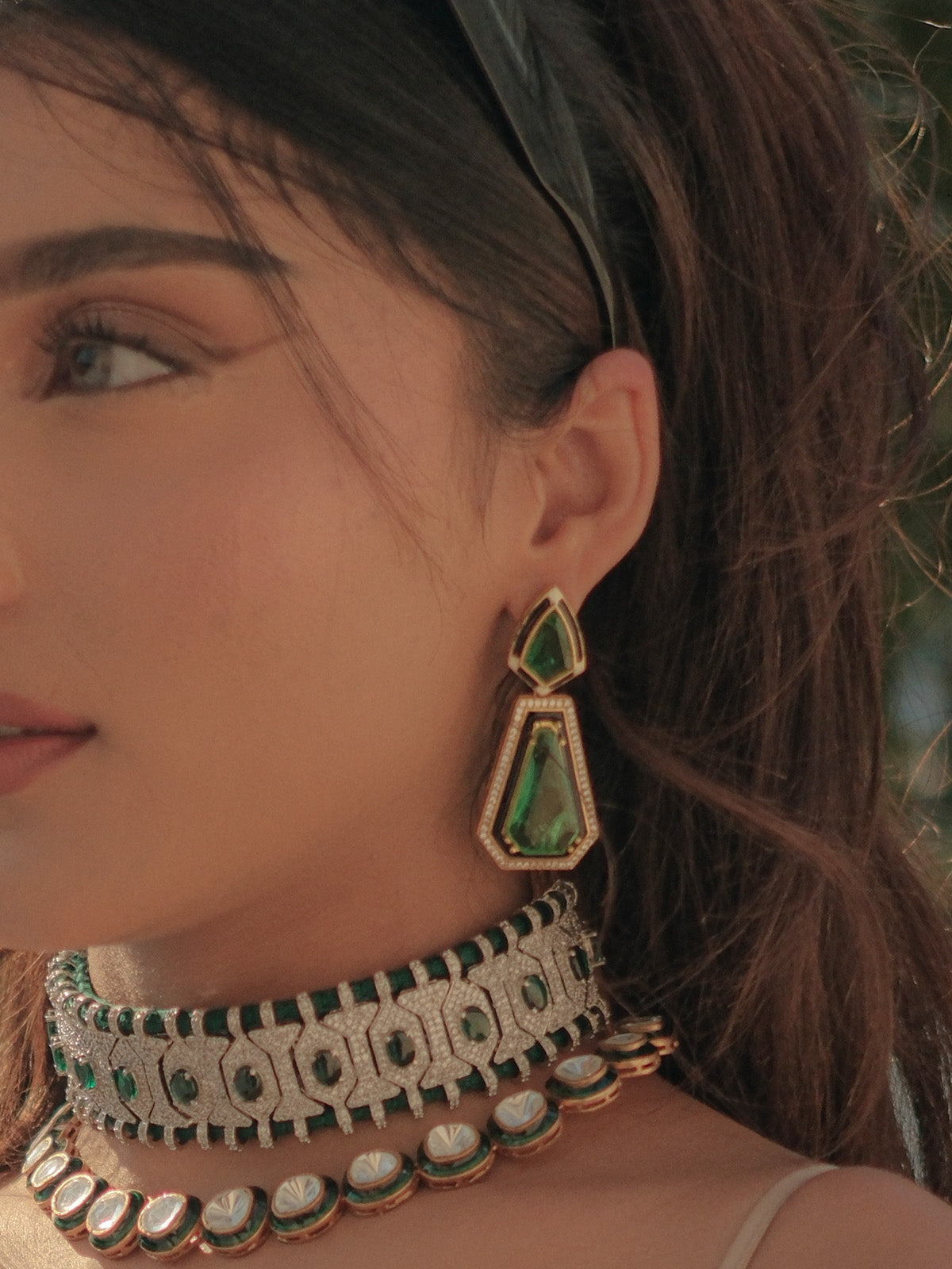 Discover the elegance of heritage-inspired jewelry with Tver’s Statement Earrings. Designed with Mughal and royal Indian influences, these earrings feature striking geometric-cut stones, set in a refined gold-tone brass frame, accented with delicate crystal embellishments. A fusion of minimalism and tradition, they are perfect for modern heirloom lovers seeking timeless, classic Indian jewelry with a contemporary edge.