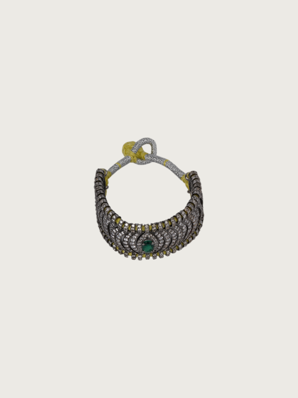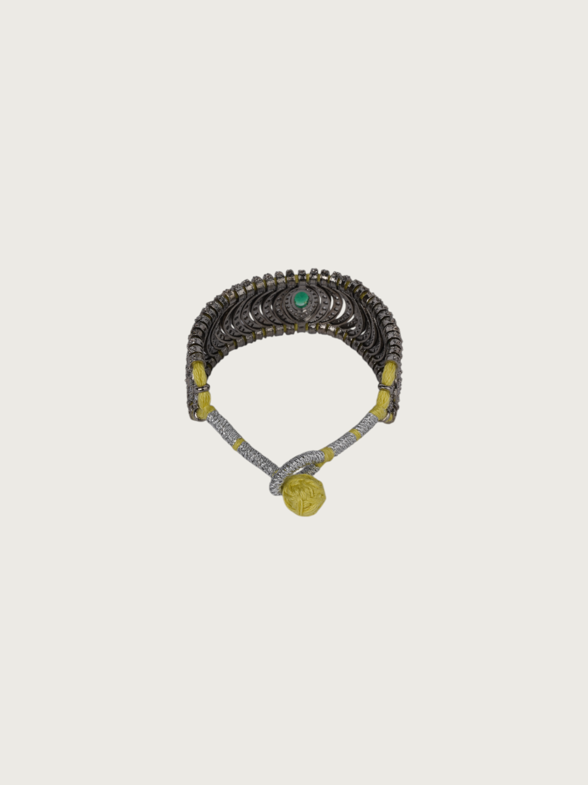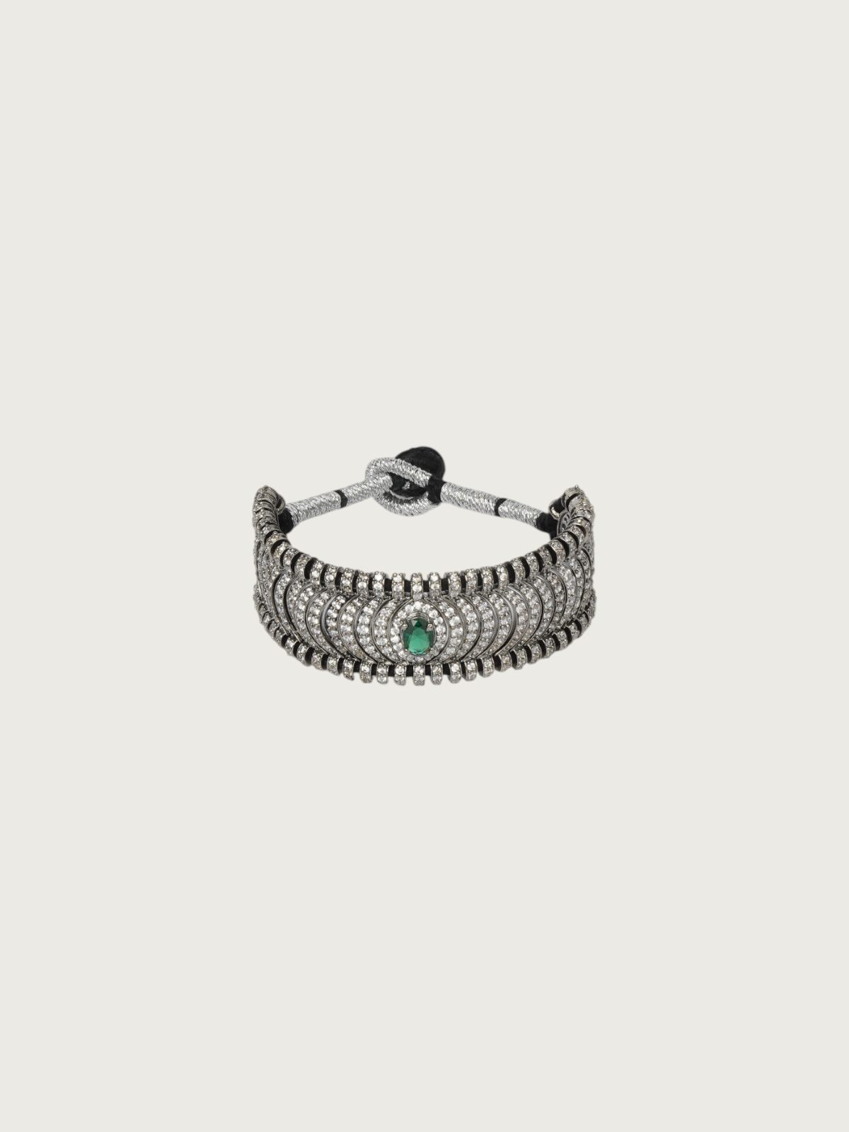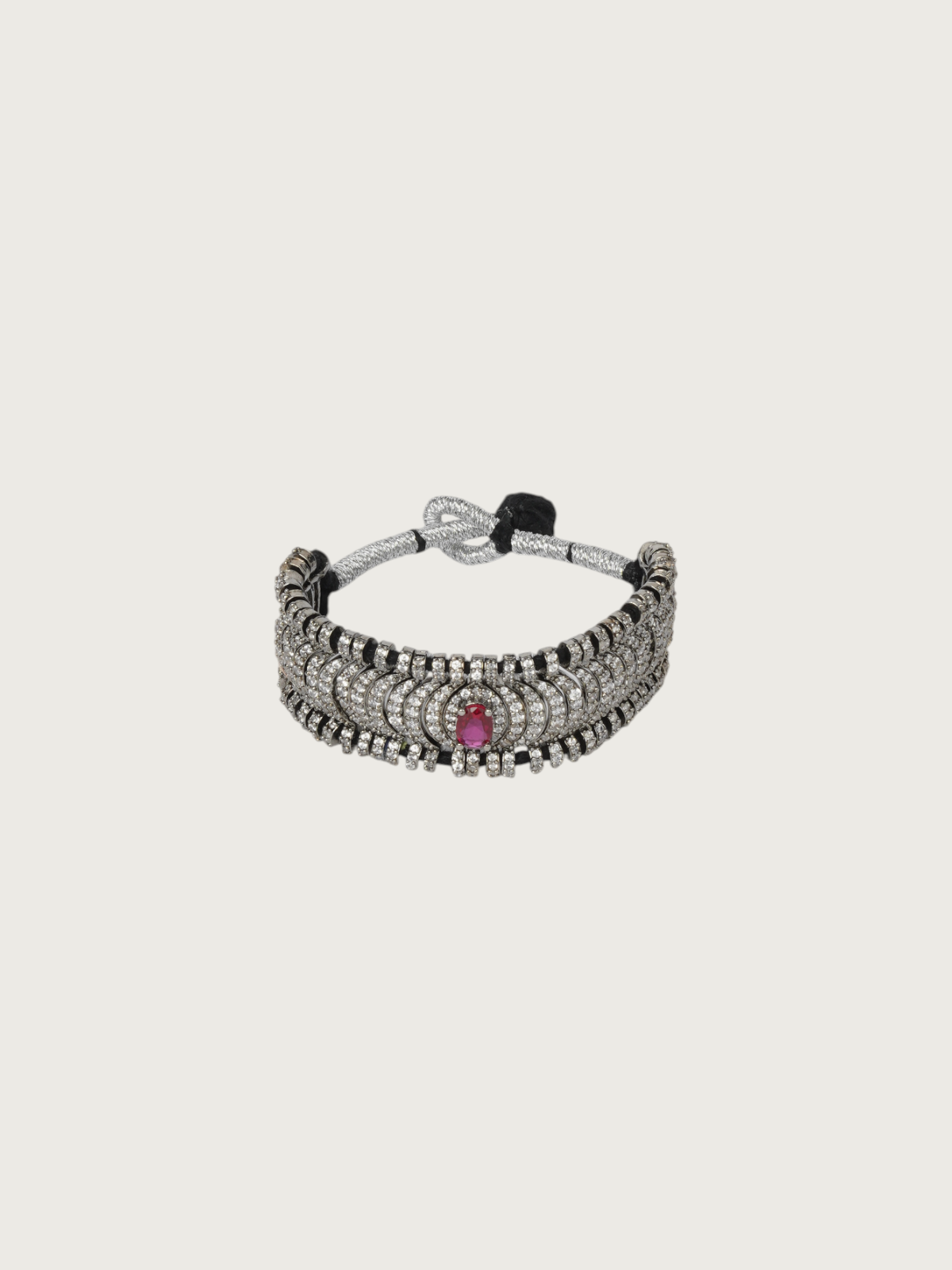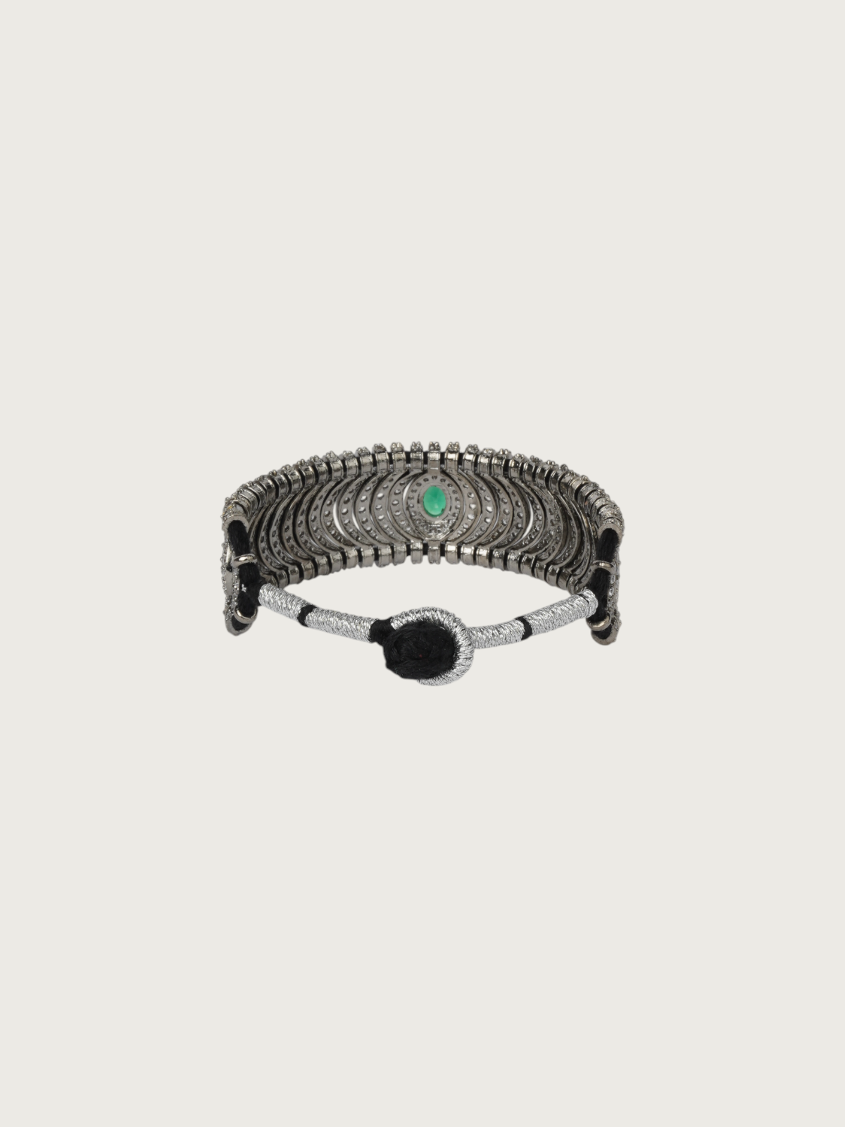 A bold fusion of sparkle and craft, these handcrafted embroidered bracelets are designed to elevate your everyday and occasionwear with ease. Featuring a statement panel of precision-cut stones in geometric and floral arrangements, each bracelet is bordered with silver and victorian-toned elements and handwoven thread in vibrant hues.