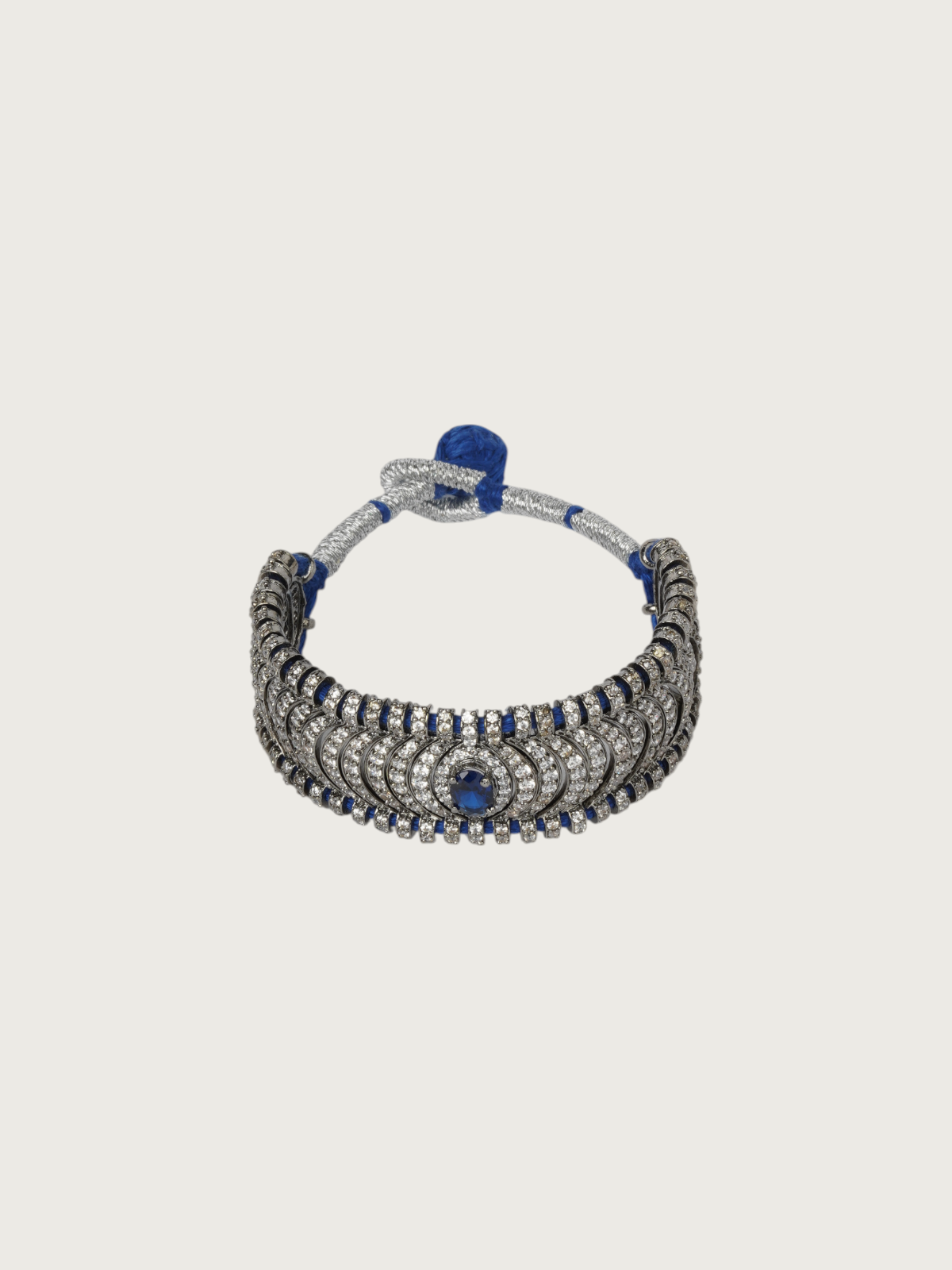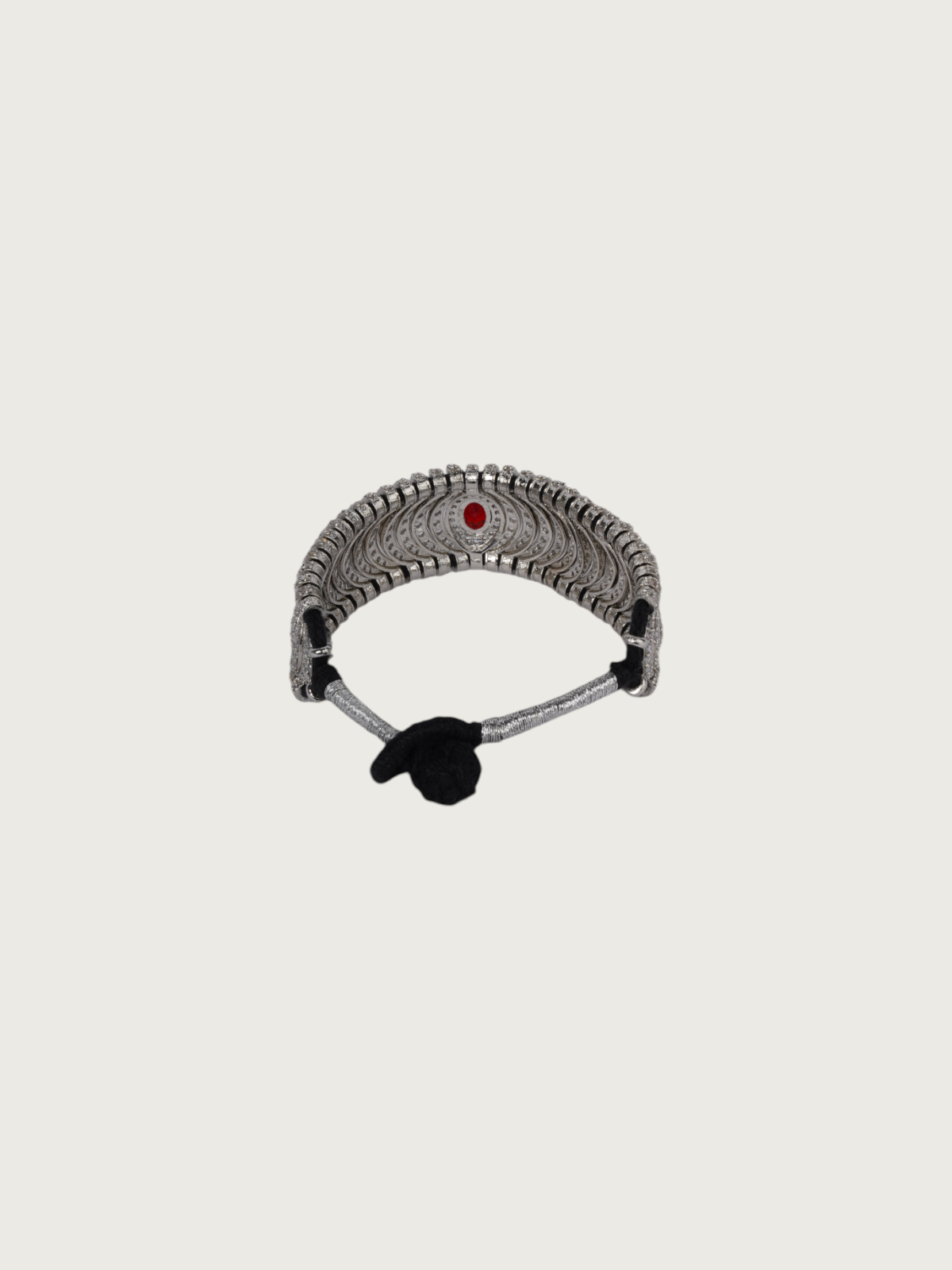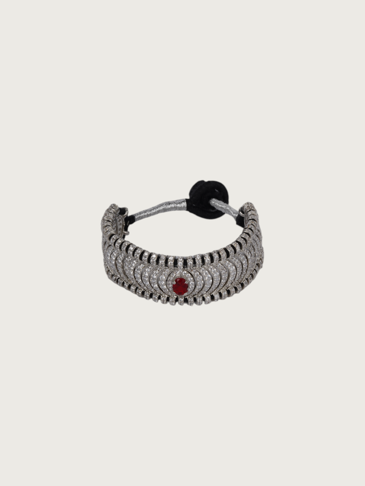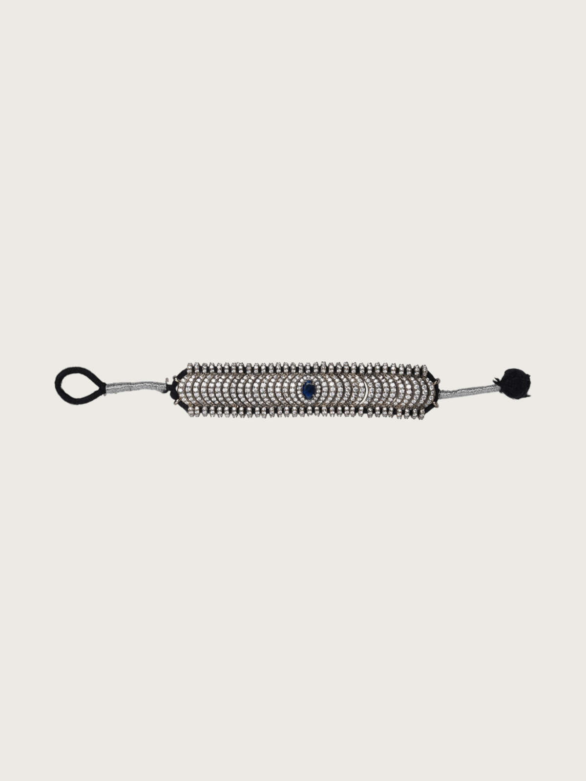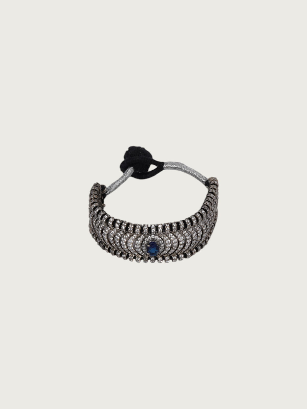 A bold fusion of sparkle and craft, these handcrafted embroidered bracelets are designed to elevate your everyday and occasionwear with ease. Featuring a statement panel of precision-cut stones in geometric and floral arrangements, each bracelet is bordered with silver and victorian-toned elements and handwoven thread in vibrant hues.