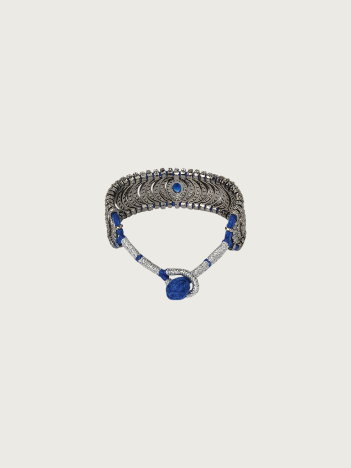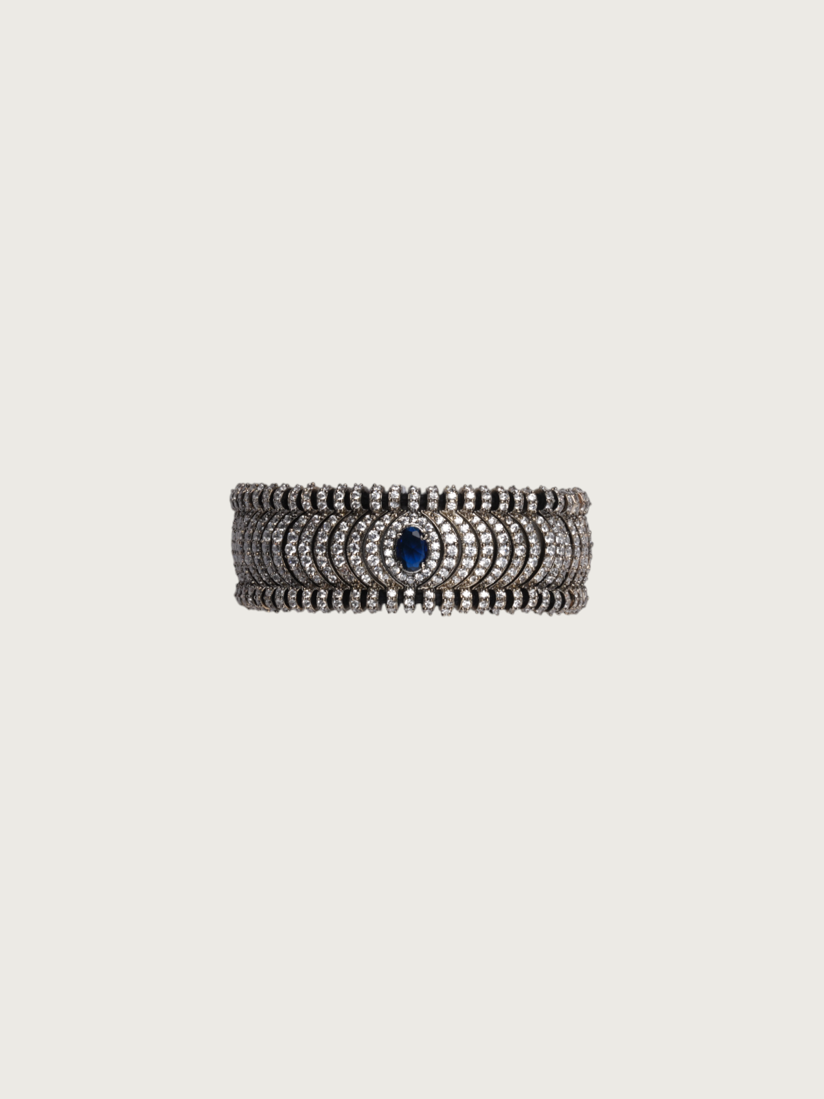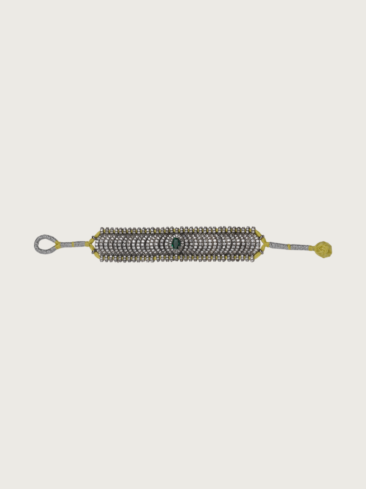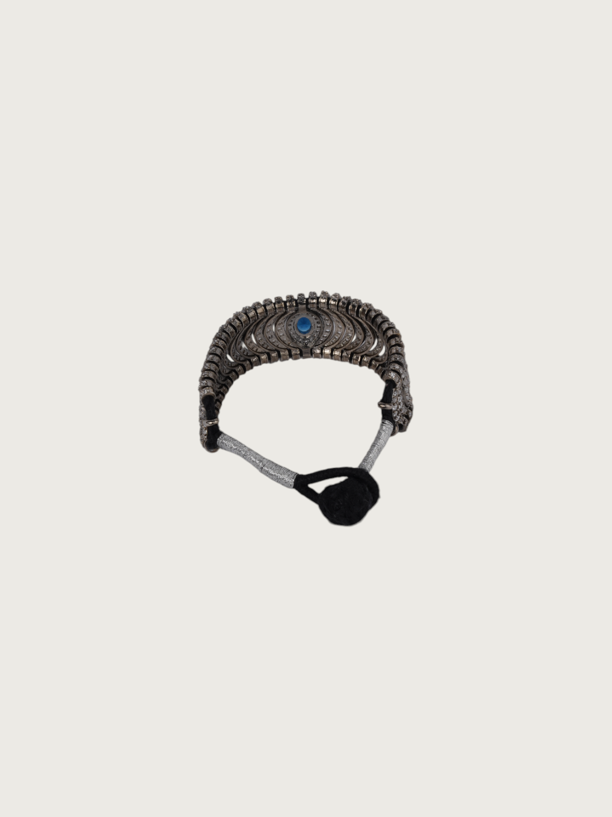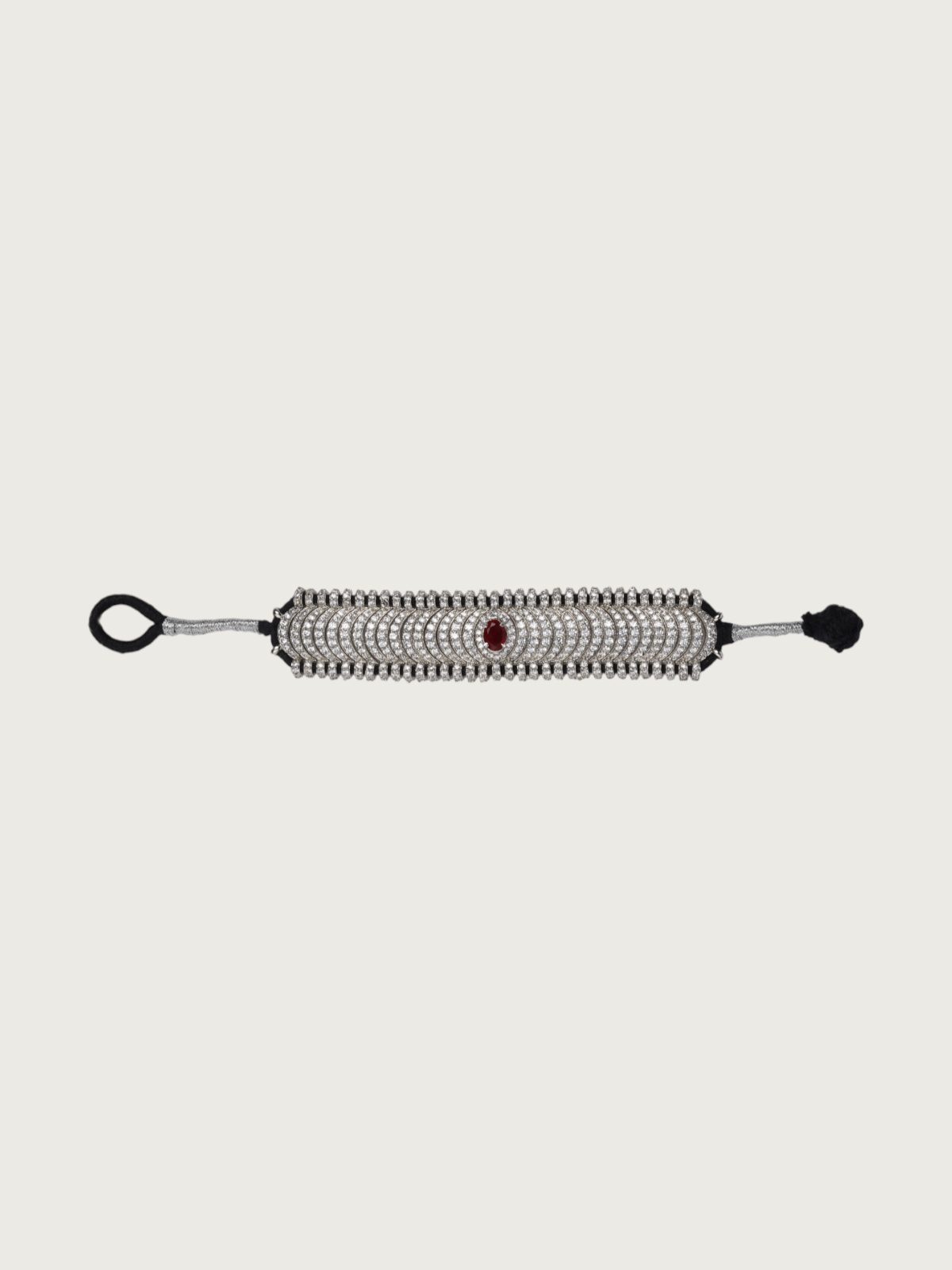 A bold fusion of sparkle and craft, these handcrafted embroidered bracelets are designed to elevate your everyday and occasionwear with ease. Featuring a statement panel of precision-cut stones in geometric and floral arrangements, each bracelet is bordered with silver and victorian-toned elements and handwoven thread in vibrant hues.