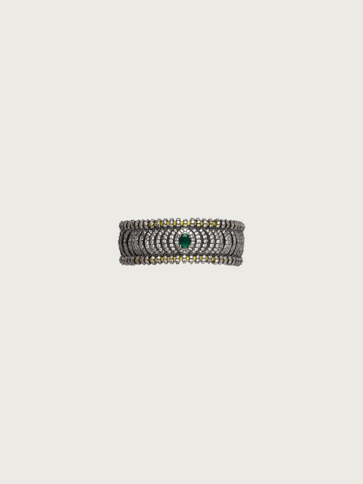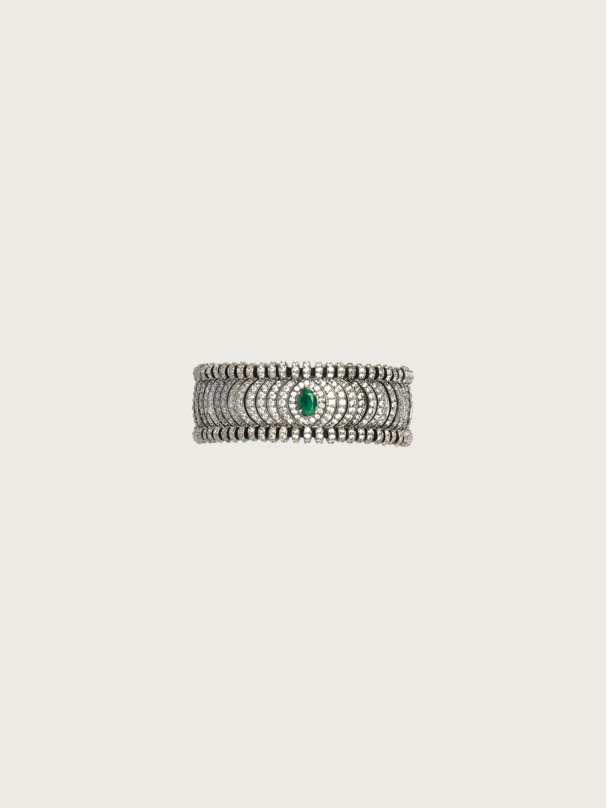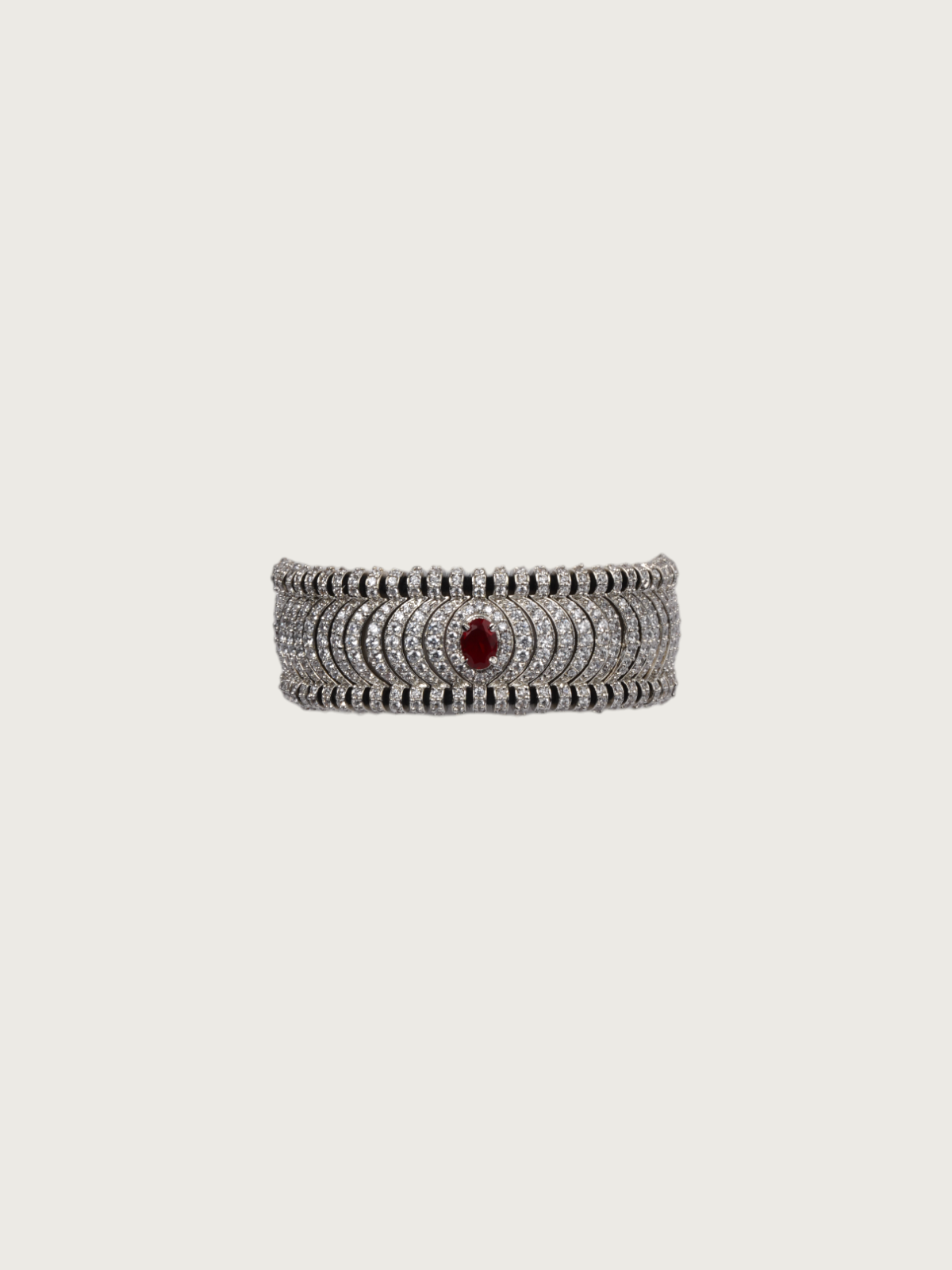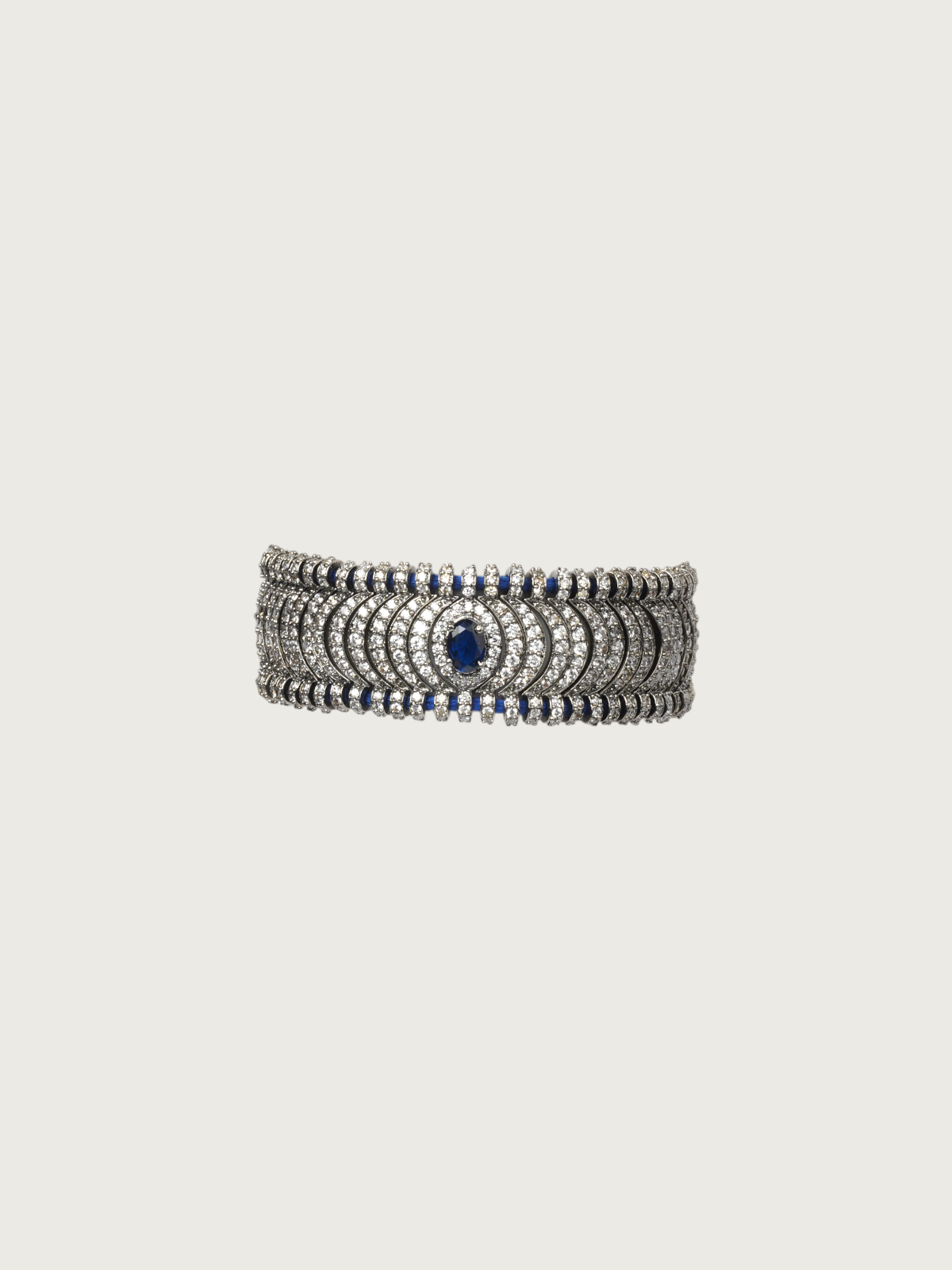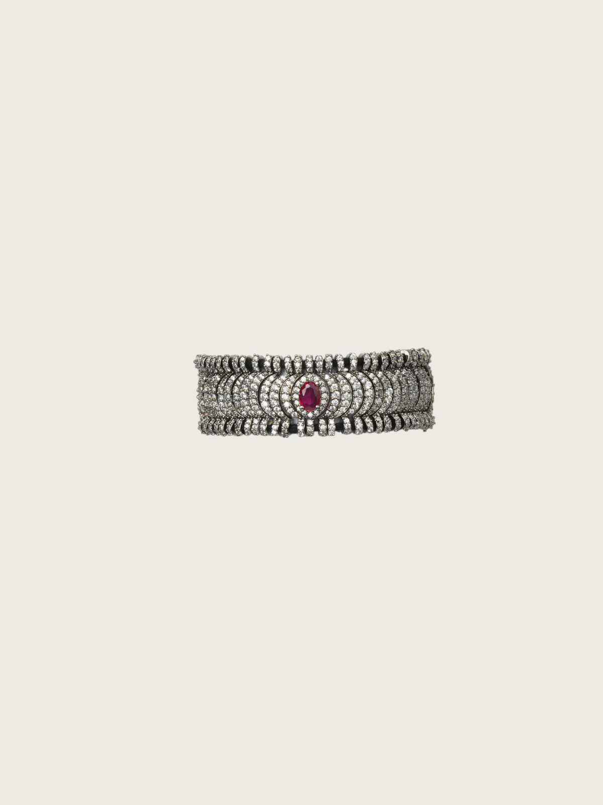 A bold fusion of sparkle and craft, these handcrafted embroidered bracelets are designed to elevate your everyday and occasionwear with ease. Featuring a statement panel of precision-cut stones in geometric and floral arrangements, each bracelet is bordered with silver and victorian-toned elements and handwoven thread in vibrant hues.