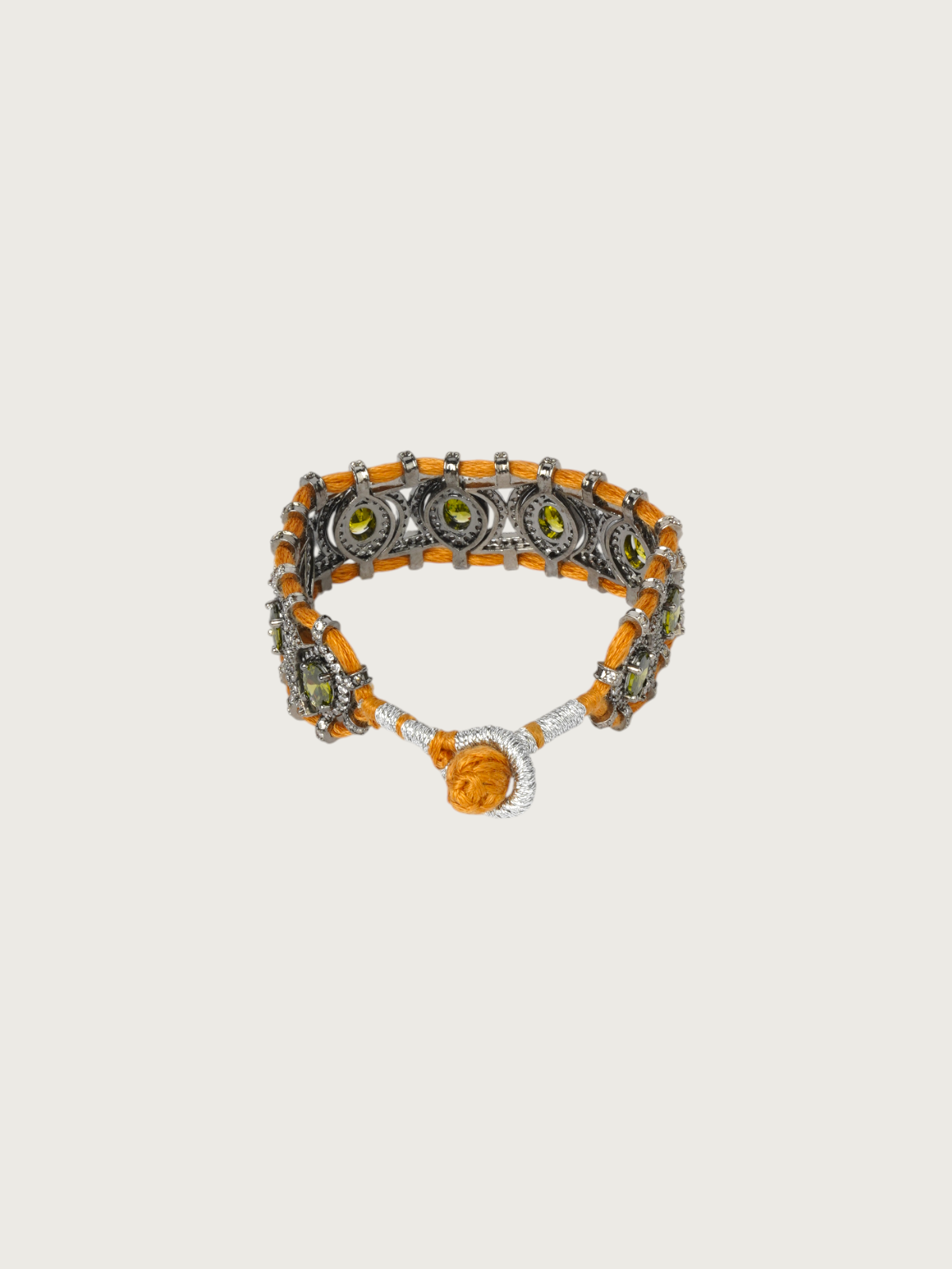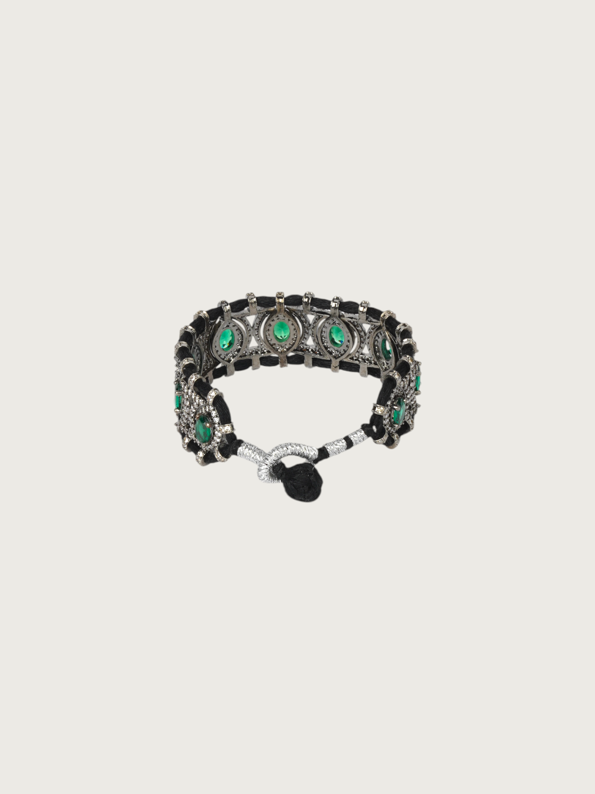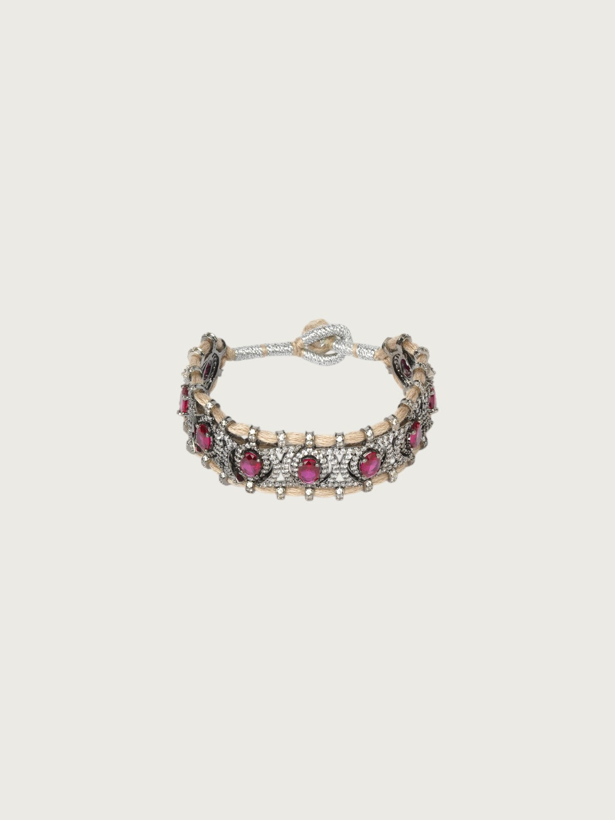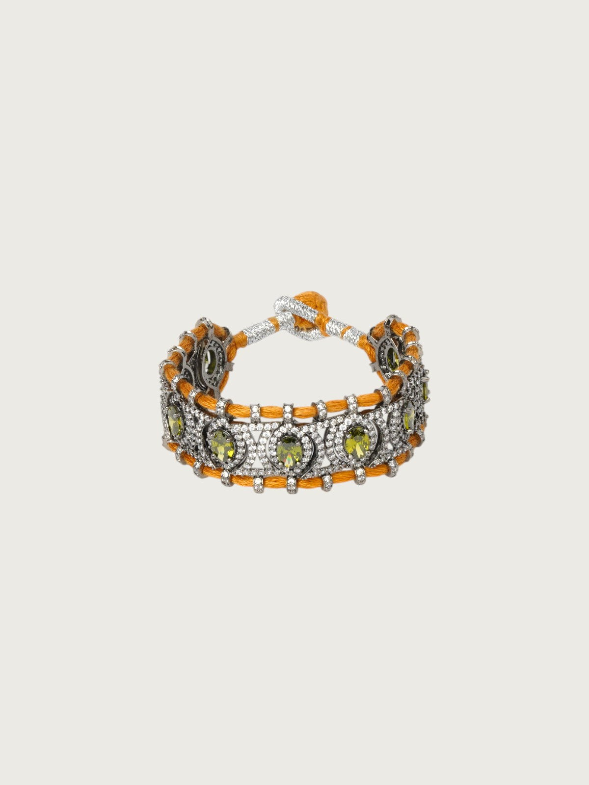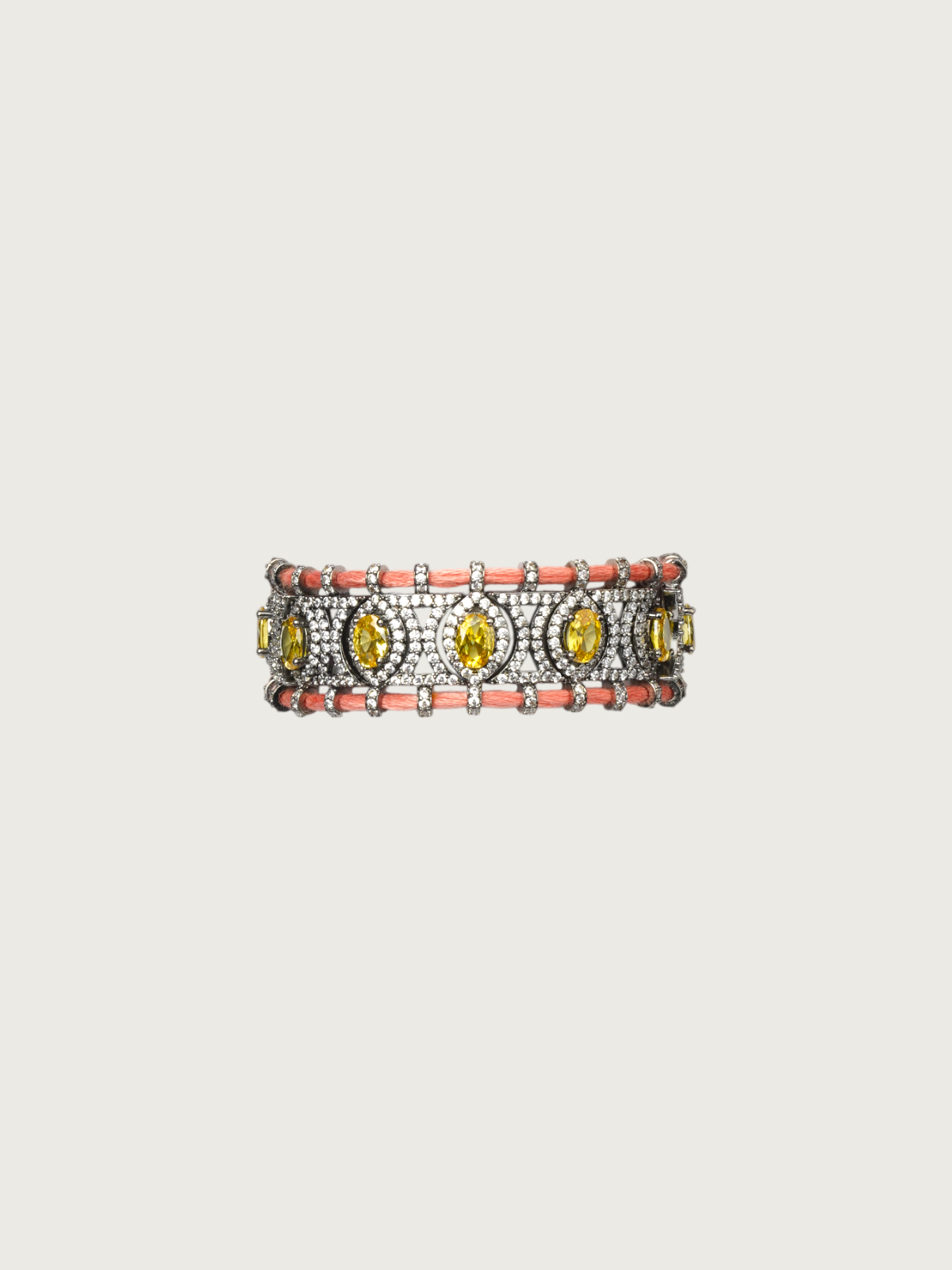 Intricately set in dual rows, the brilliant stones range from turquoise, emerald green, and dark pink to sapphire blue, lilac, citrine yellow, and deep garnet – each offering a distinct style story. Wrapped in bold hues of mustard, lime green, soft peach, black, and coral-toned threads, these bracelets create a stunning contrast against the antique finish of the metalwork.