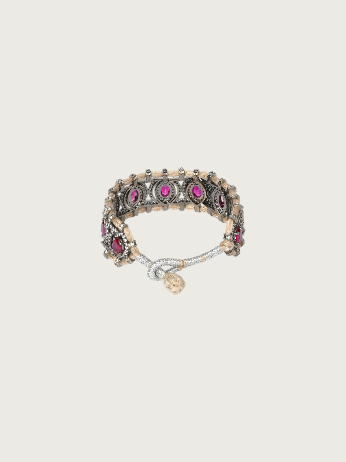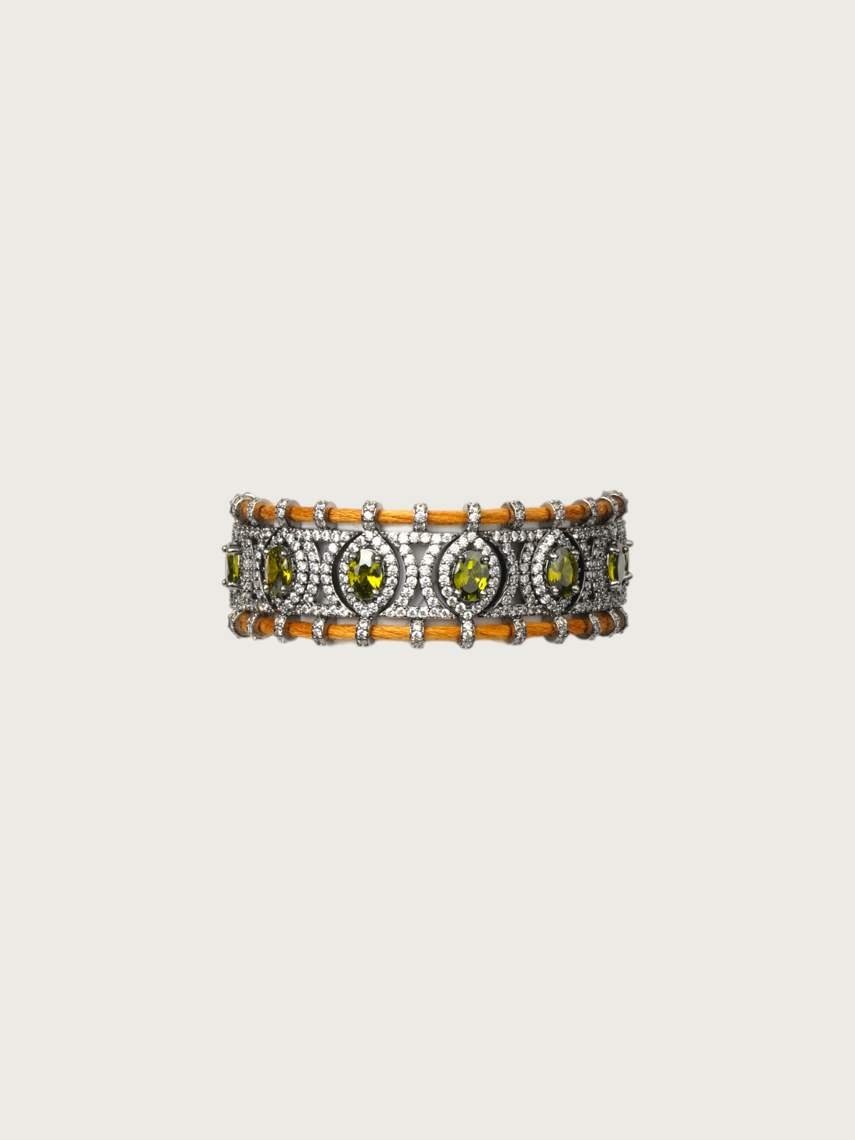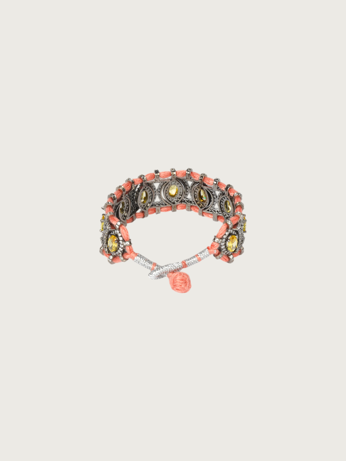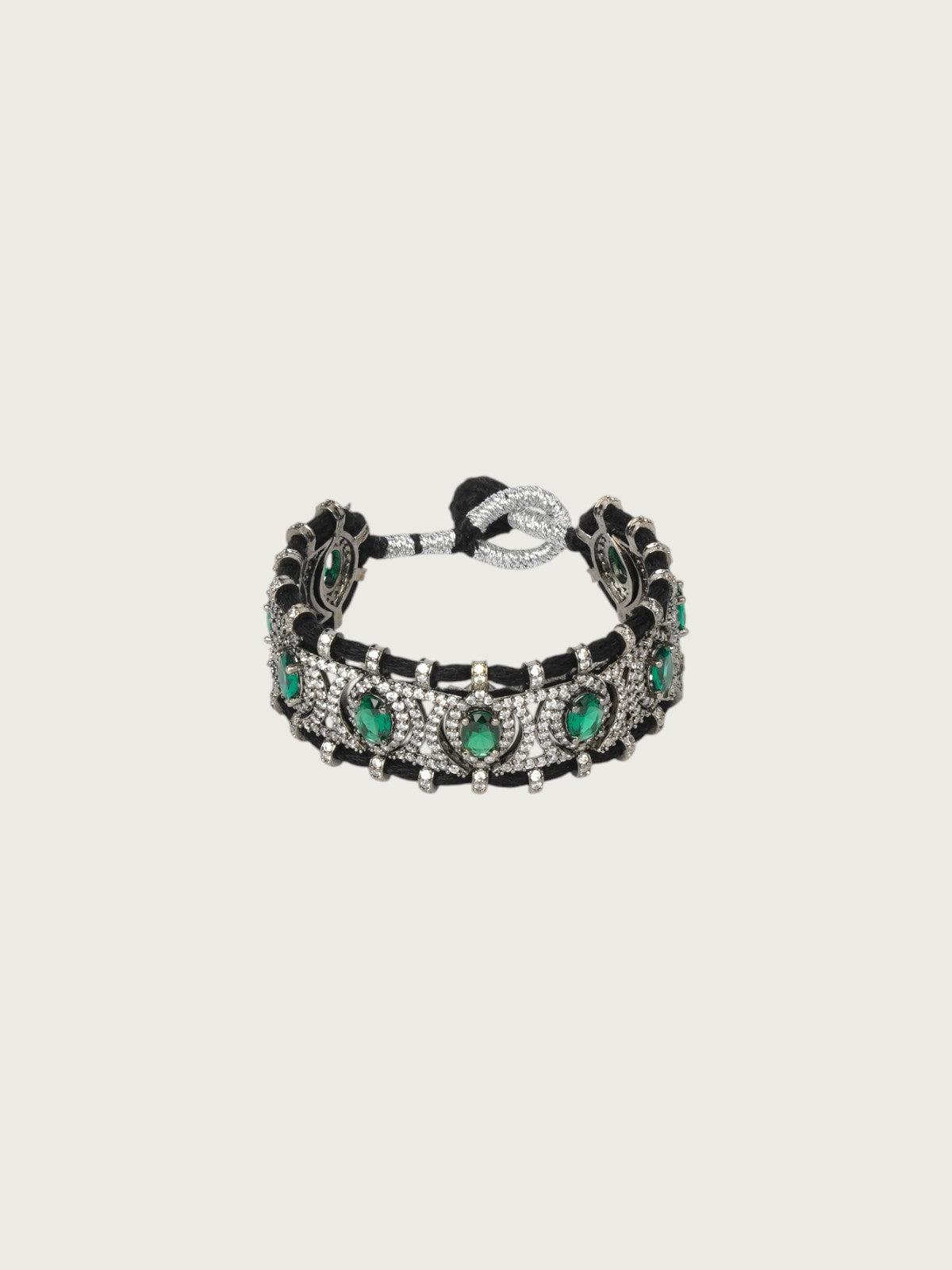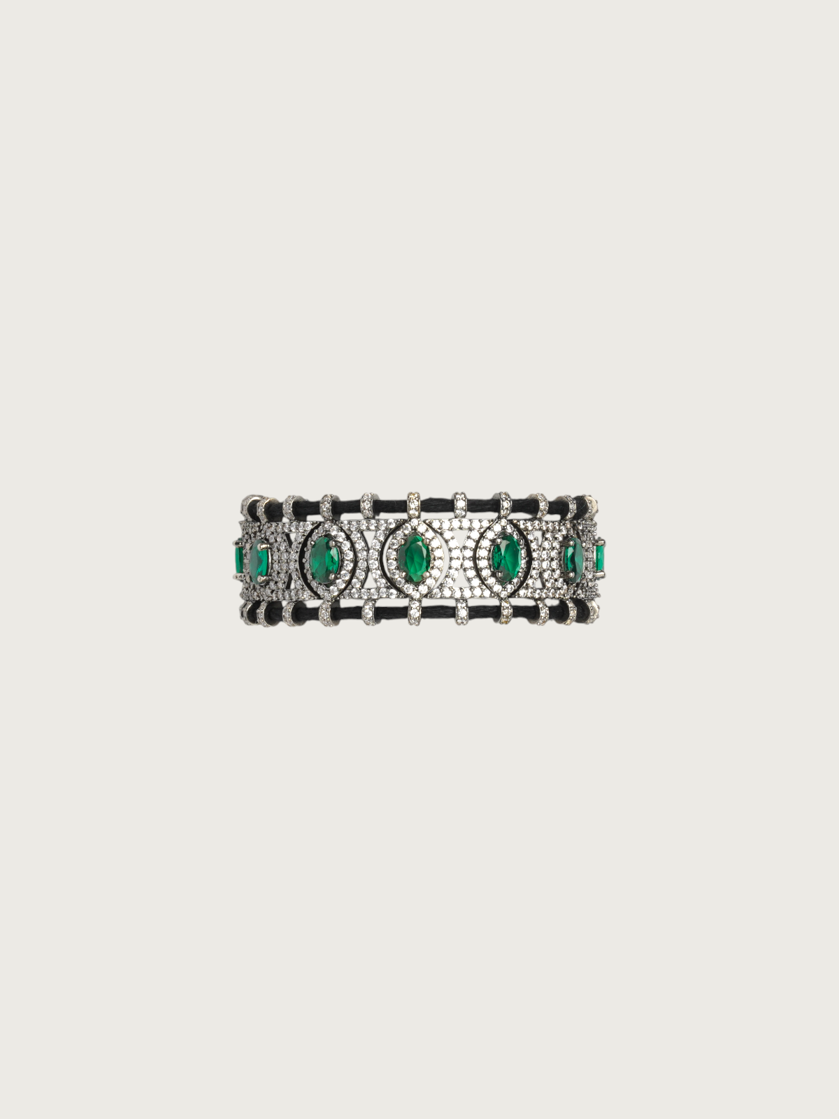 Intricately set in dual rows, the brilliant stones range from turquoise, emerald green, and dark pink to sapphire blue, lilac, citrine yellow, and deep garnet – each offering a distinct style story. Wrapped in bold hues of mustard, lime green, soft peach, black, and coral-toned threads, these bracelets create a stunning contrast against the antique finish of the metalwork.