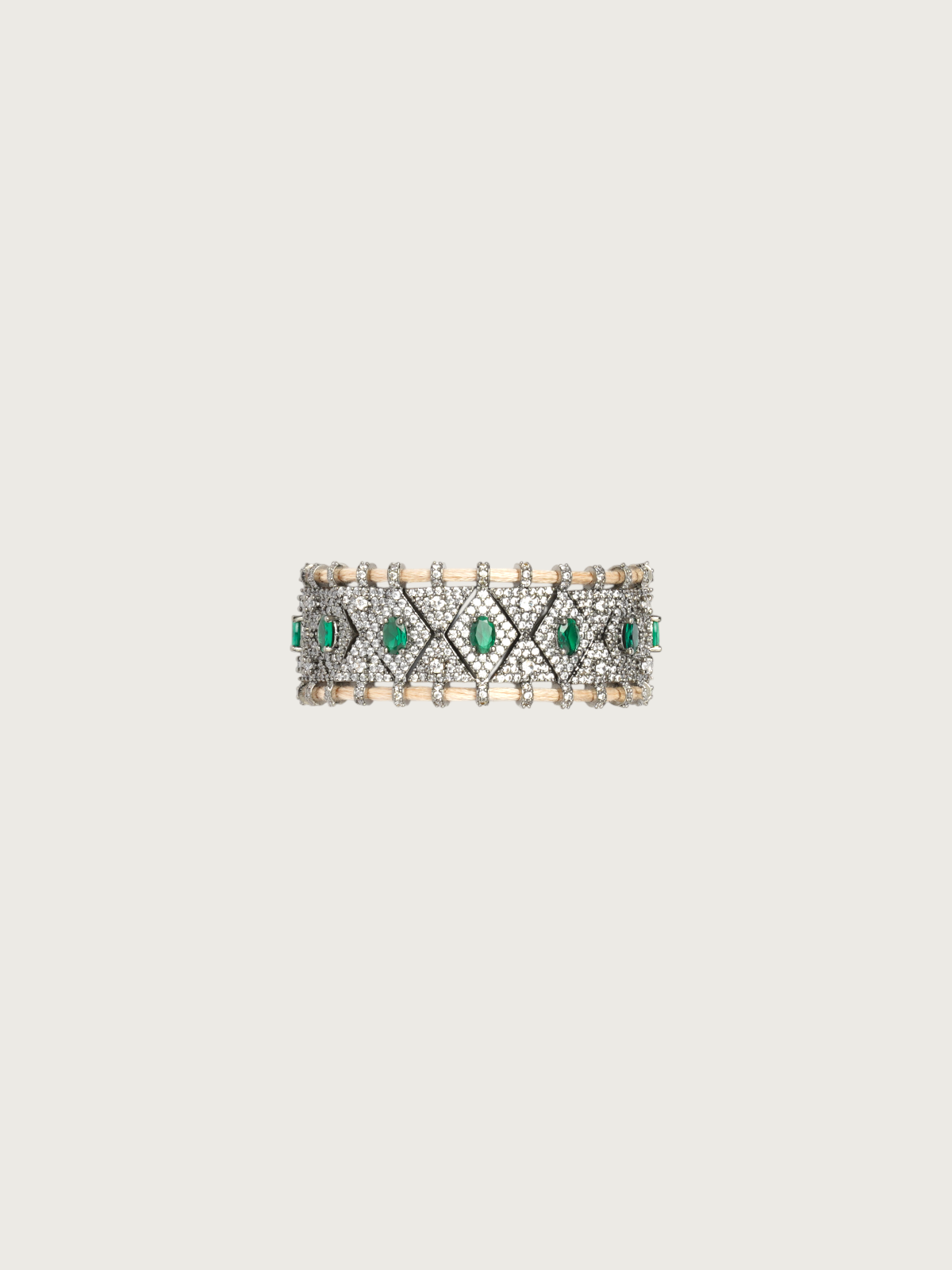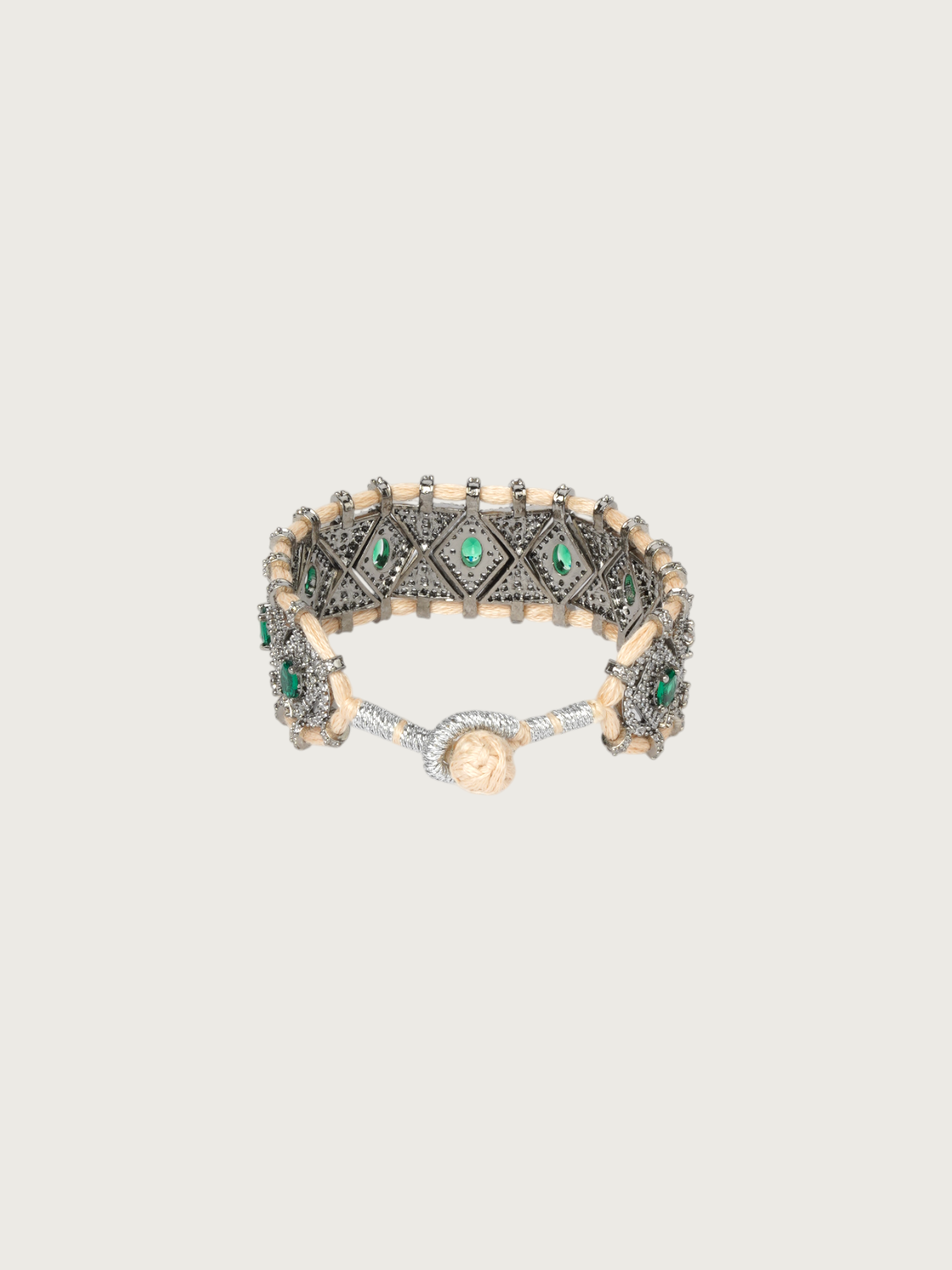 The bracelets showcase intricate detailing with oxidized textures, encrusted surfaces, and symmetrical patterns that form a striking contrast against the bright silk threads. Whether it’s geometric motifs, diamond-shaped frames, or concentric circular arrangements, every design reflects Tver's signature blend of heritage artistry and boho-chic flair.