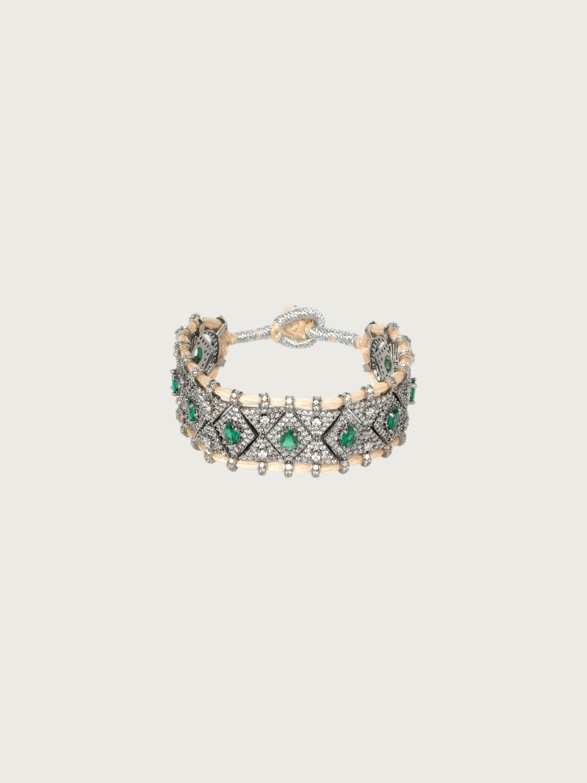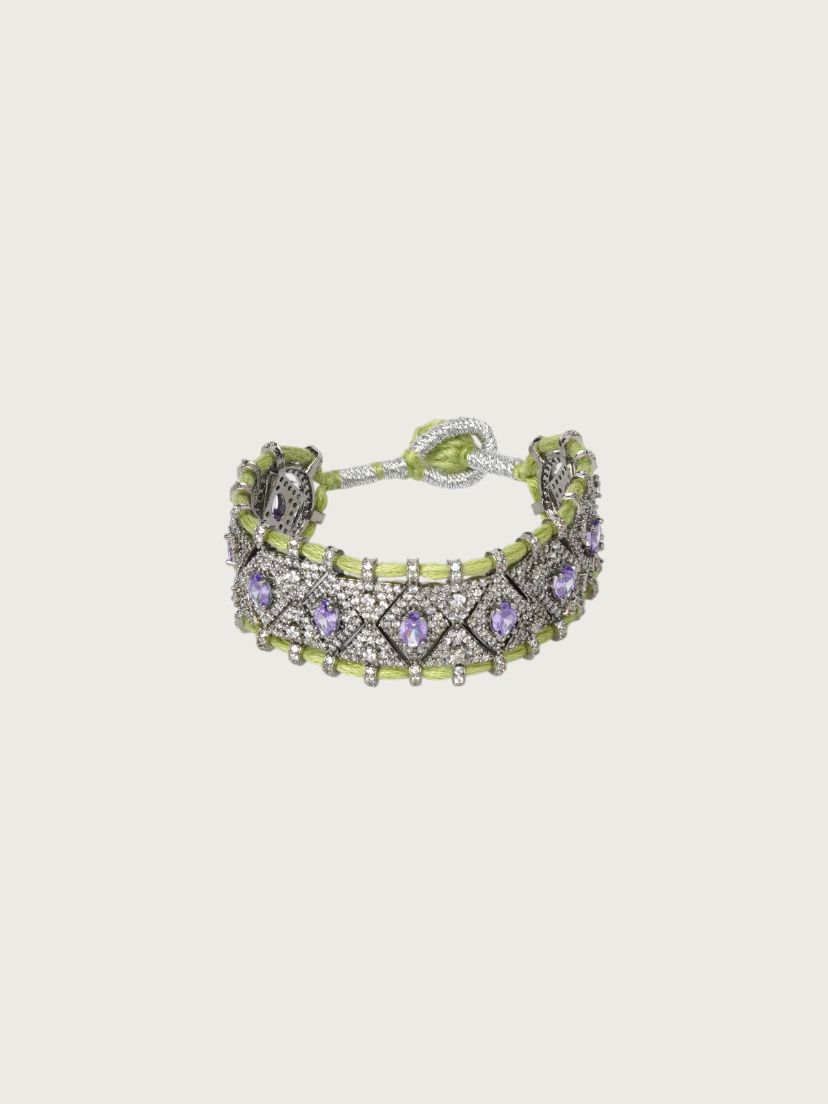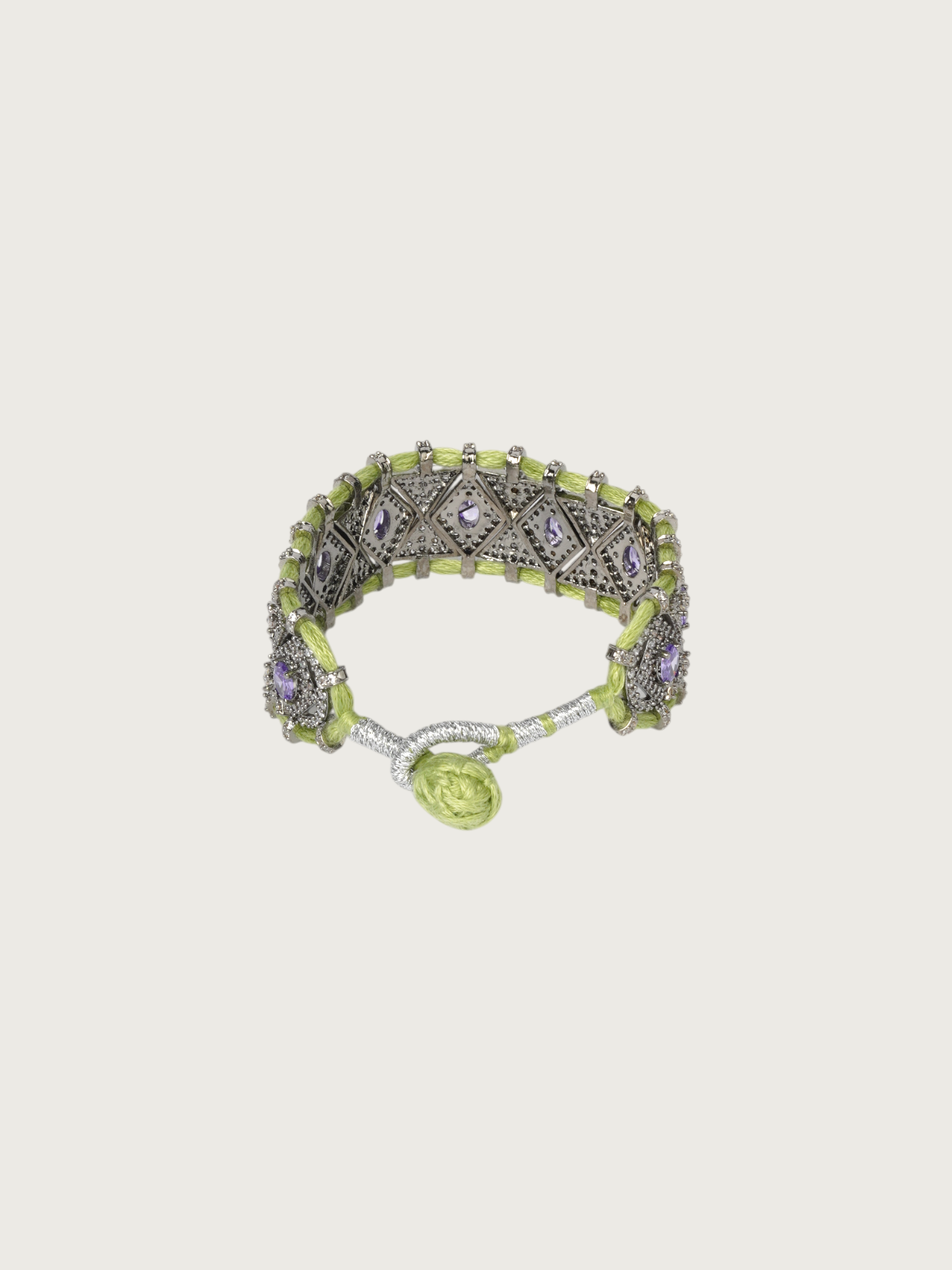 Add a splash of vibrant charm to your jewelry collection with these handcrafted bracelets, featuring dazzling stonework paired with colorful threads. Each piece is set on an victorian-toned finish, studded with sparkling stones in a variety of hues – from rich greens to purples – offering an eclectic mix of elegance and playfulness.