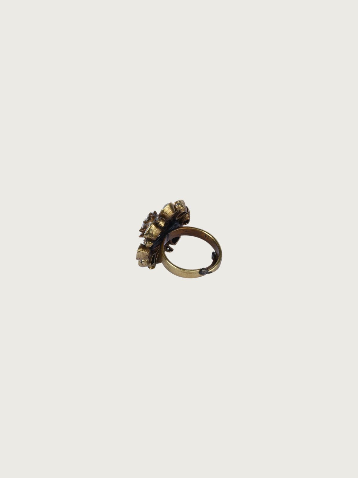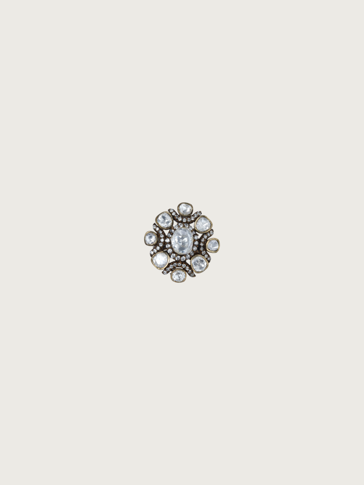 A timeless beauty crafted in a victorian-toned finish, this Victorian-style ring features a striking floral motif studded with sparkling white stones. The central oval stone is surrounded by a delicate arrangement of smaller stones, forming a lush blooming flower pattern. Perfect for those who appreciate vintage-inspired elegance with a regal twist.